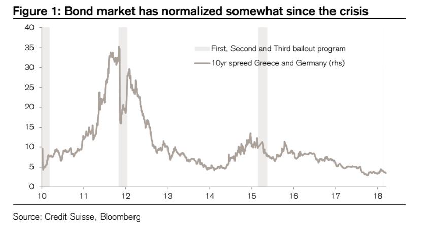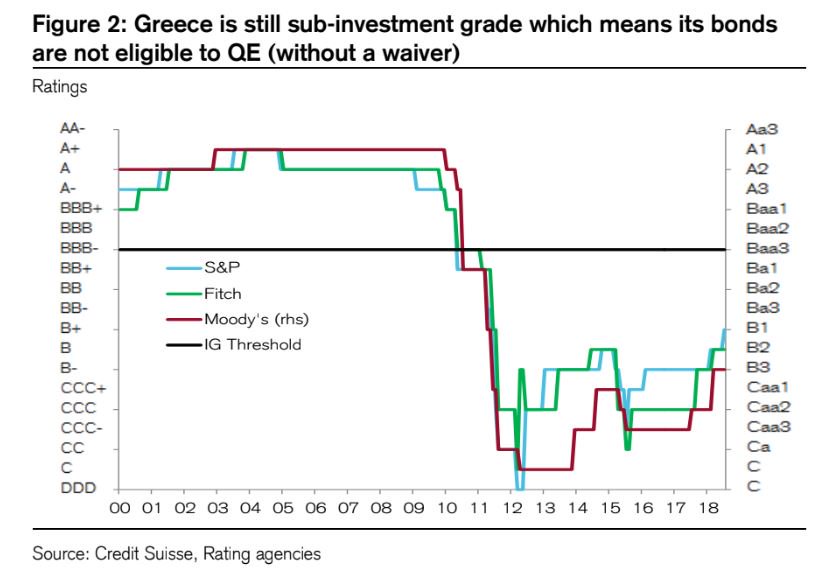 Χωρίς waiver δεν υπάρχει QE αναφέρει η Credit Suisse σε ανάλυσή της με ημερομηνία 20 Ιουλίου 2018, σημειώνοντας ωστόσο ότι το πιθανότερο σενάριο είναι μια θετική DSA για το ελληνικό χρέος, η οποία θα στείλει ένα θετικό μήνυμα στις αγορές.