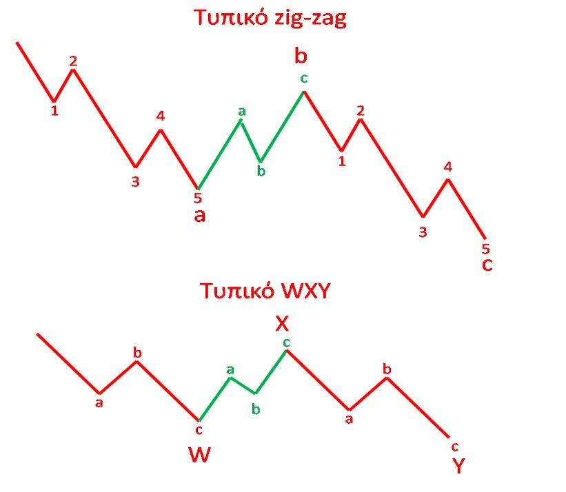 Θα προσεγγίσουμε όμως το θέμα βασιζόμενοι στο γεγονός ότι σε κύμα 2 οι πιθανότεροι διορθωτικοί σχηματισμοί είναι το τυπικό zig-zag (5-3-5) και το τυπικό WXY (3-3-3) όπως θεωρητικά φαίνονται παρακάτω: