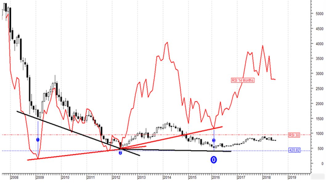 Το παραπάνω διάγραμμα (μηνιαίο) εμφανίζει την τιμή του ΓΔ από τον Οκτ του 2007 μέχρι σήμερα και την τιμή του RSI με περίοδο 14 μηνών.