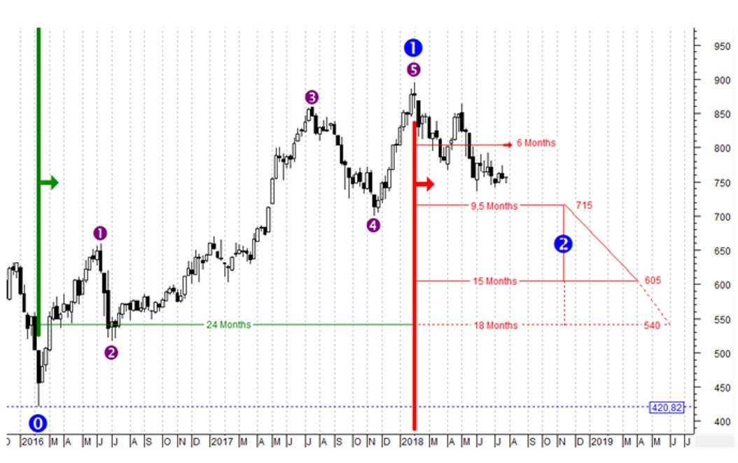 Παραλείπουμε τους μαθηματικούς υπολογισμούς που οδηγούν στο ότι η διόρθωση αναμένεται θεωρητικά να ολοκληρωθεί εντός του κόκκινου τραπεζίου (συνεχόμενη γραμμή) στο παραπάνω σχήμα δηλαδή με απλά λόγια να διαρκέσει από 9,5 μήνες μέχρι 15 μήνες και να φτάσει από τις 715 μονάδες μέχρι τις 605 μονάδες.