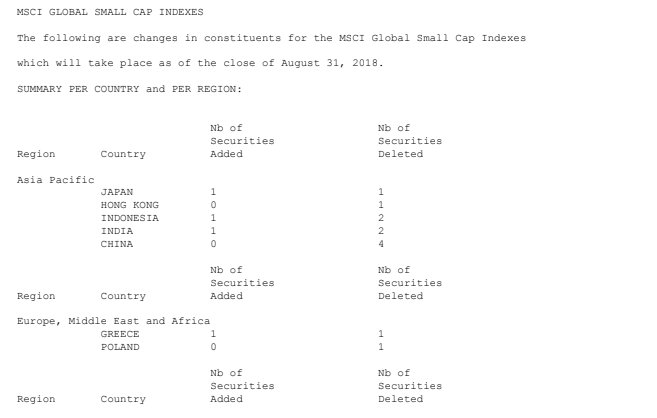 Σε ό,τι αφορά τον δείκτη MSCI Global Small Cap, οι περισσότερες αφαιρέσεις αφορούν κινεζικές μετοχές, ενώ δεν υπήρξε προσθήκη καμίας κινεζικής εταιρείας, όπως φαίνεται και στον πίνακα που ακολουθεί.