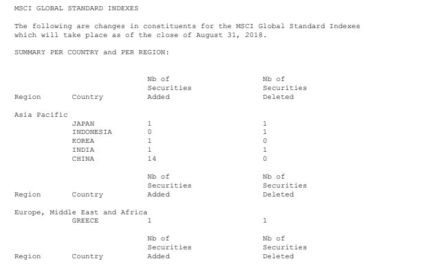 Σε μία απόλυτα αναμενόμενη ενέργεια προχώρησε σήμερα (14 Αυγούστου 2018) η MSCI.