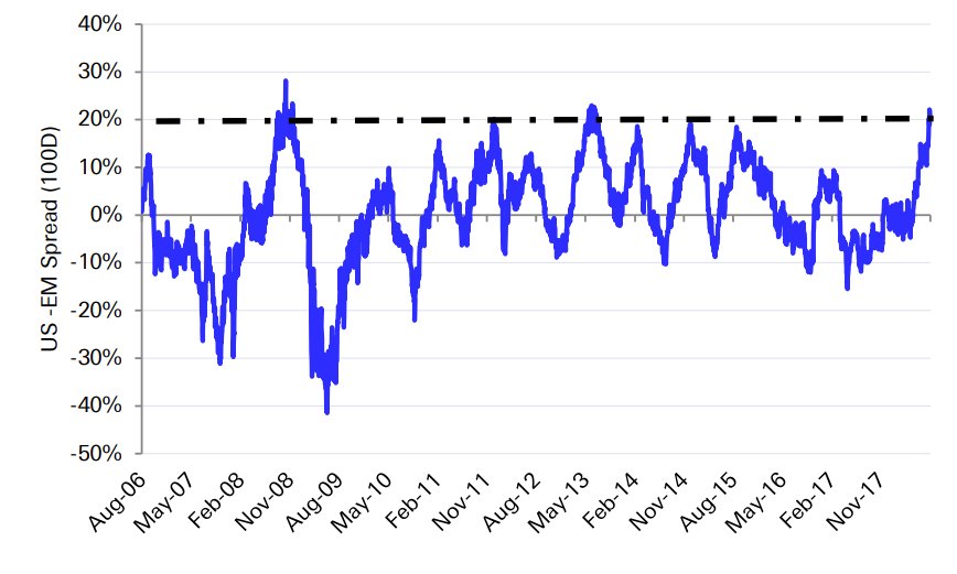 Το ακραίο spread μεταξύ των χρηματιστηριακών δεικτών στις αναδυόμενες αγορές (με βάση τον δείκτη της MSCI, MSCI Emerging Markets) και τη Wall Street (με βάση τον δείκτη S&P 500), το οποίο έχει φθάσει πλέον σε υψηλό 14 μηνών, αναμένεται να περιοριστεί τους επόμενους μήνες, αφήνουν να εννοηθεί σε έκθεσή τους οι αναλυτές της Deutsche Bank.