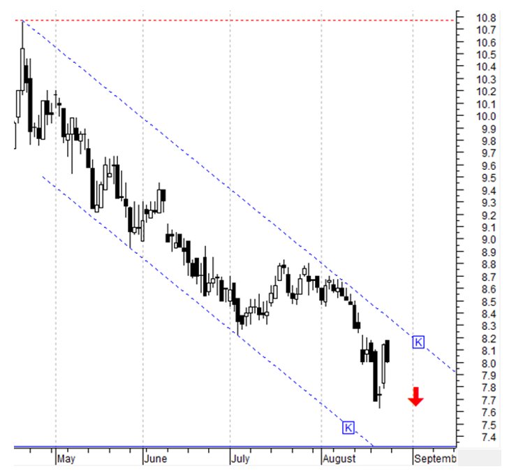 Σε βραχυπρόθεσμο επίπεδο μια πρώτη ένδειξη αλλαγής της τάσης θα είναι η ανοδική έξοδος από το καθοδικό κανάλι Κ που οδηγεί την διόρθωση.