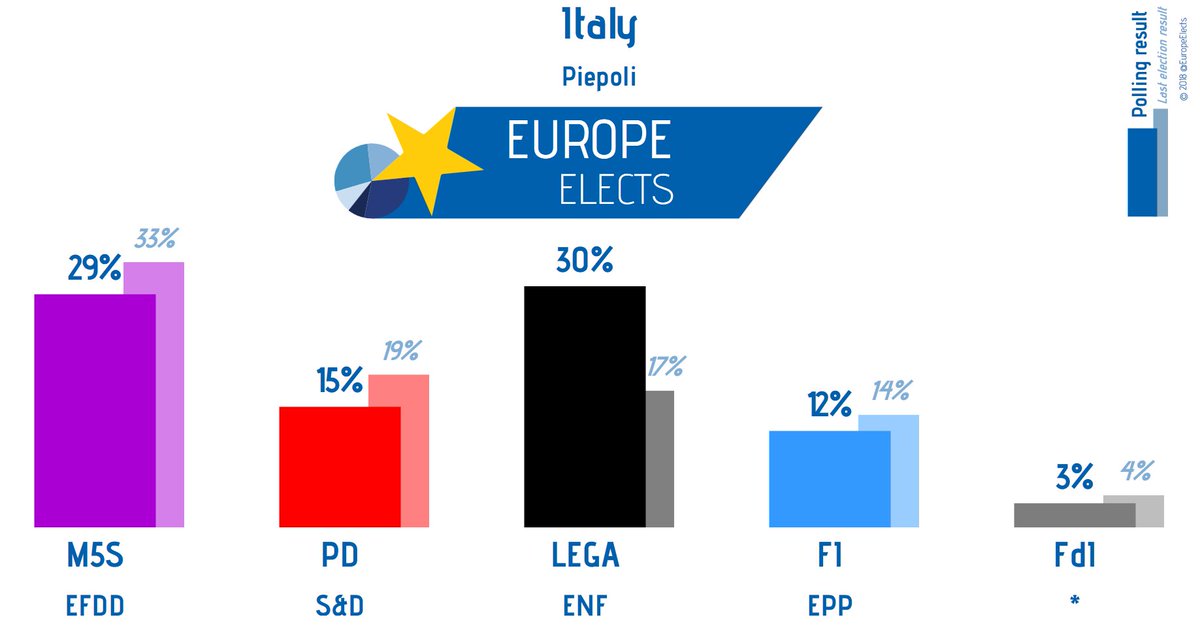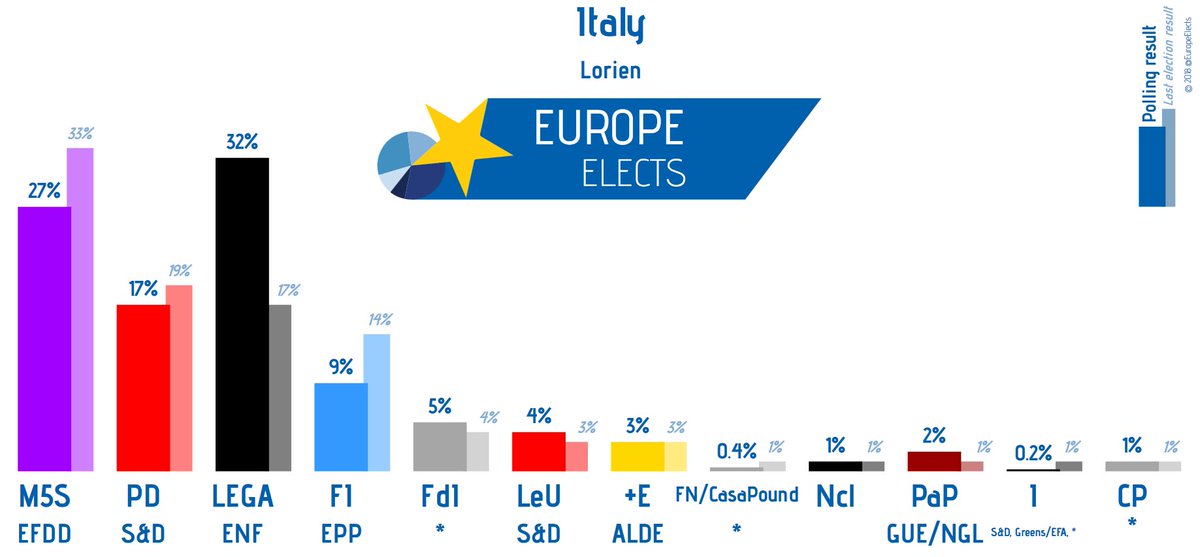Η εικόνα αυτή έχει ριζικά αλλάξει στην Ιταλία καθώς η Lega North πλέον βρίσκεται στο 30% με 34% και πλέον είναι πρώτο κόμμα στην Ιταλία.