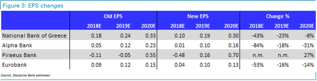 Στο πλαίσιο αυτό, η Deutsche Bank υποβαθμίζει και τις εκτιμήσεις της για την κερδοφορία των τραπεζών, αντανακλώντας τα αποτελέσματα του 2ου τριμήνου, αλλά και των αυξημένων προβλέψεων λόγω NPEs.