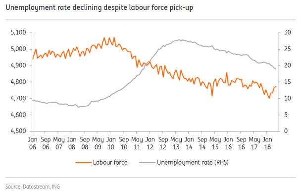 Η ανάπτυξη βασίστηκε στην άνοδο των εξαγωγών, ενώ η απασχόληση έχει αυξηθεί κατά 1,5% σε ετήσια βάση κατά το πρώτο εξάμηνο του 2018 και η ανεργία υποχώρησε κάτω από το 20% για πρώτη φορά μετά το τρίτο τρίμηνο του 2011.