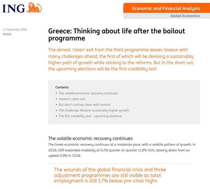 Μάλιστα, στην 5σέλιδη ανάλυση της με τίτλο «Ελλάδα: Η ζωή μετά το πρόγραμμα διάσωσης» (Greece: Thinking about life after the bailout programme), η ING επισημαίνει ότι η βασική πρόκληση στο εξής είναι η αποκατάσταση βιώσιμης υψηλότερης ανάπτυξης, καθώς οι πληγές της παγκόσμιας χρηματοπιστωτικής κρίσης και των τριών προγραμμάτων προσαρμογής παραμένουν ορατές καθώς η συνολική απασχόληση είναι ακόμα 17% κάτω από τα προ κρίσης υψηλά.