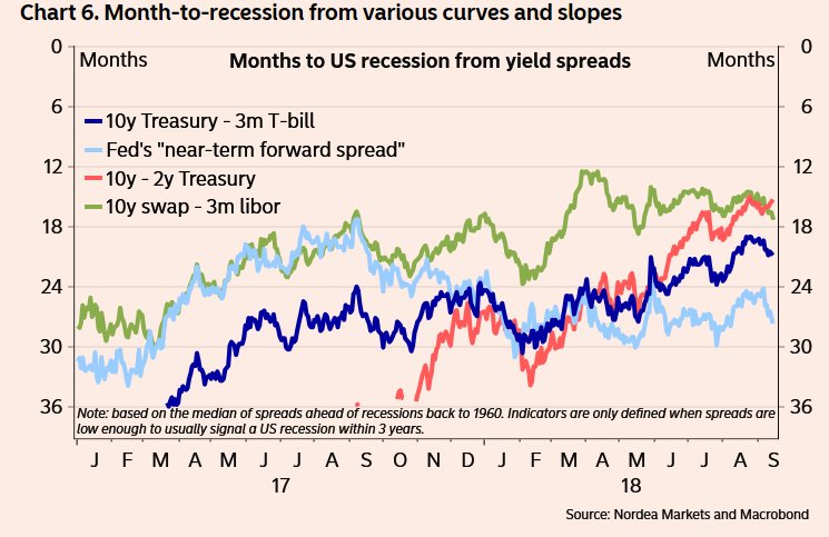 Η καμπύλη αποδόσεων (μεταξύ 10ετούς και 2ετούς κρατικού ομολόγου), η οποία τείνει ορισμένες φορές να αντιστραφεί, αποδεικνύει πως η επόμενη ύφεση πλησιάζει στις Ηνωμένες Πολιτείες, εκτιμούν οι αναλυτές της Nordea Markets.