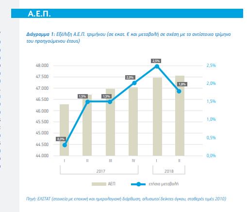 Tο ΑΕΠ εκτιµάται ότι αυξήθηκε κατά 1,8% το β’ τρίµηνο του 2018 έναντι του αντιστοίχου τριµήνου του 2017, ενώ σε εξαµηνιαία βάση προσεγγίζει το 2,2%, όπως τονίζεται στο τεύχος Σεπτεμβρίου για τις Μακροοικονομικές και Δημοσιονομικές Εξελίξεις.
