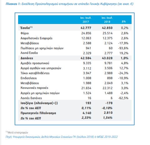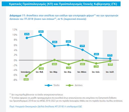 Σύμφωνα με το δημοσιονομικό συμβούλιο, ο κρατικός προϋπολογισμός παρουσίασε θετική εικόνα το πρώτο επτάµηνο του 2018, µε τα έσοδα του Τακτικού Προϋπολογισµού (ΤΠ) (προ επιστροφών και άνευ αποκρατικοποιήσεων) να υπερβαίνουν ελαφρά τους στόχους.