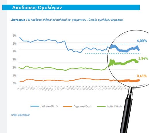 Όπως τονίζεται, η απόδοση του ελληνικού δεκαετούς οµολόγου κατά τους τελευταίους µήνες και ειδικά µετά τις ιταλικές εκλογές διατηρείται σε ένα εύρος τιµών µεταξύ 3,8%-4,6%.,