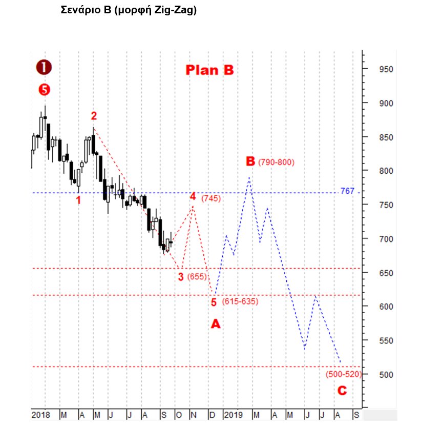 Σύμφωνα με αυτό το σενάριο βρίσκεται σε εξέλιξη ή έχει ολοκληρωθεί το κύμα 3 του Α. Αν δεν έχει ολοκληρωθεί αναμένεται συνέχιση της καθόδου προς τις 655 μονάδες και στη συνέχεια η εξέλιξη του κύματος 4 που έχει (θεωρητικά) πάνω όριο τις 767 μονάδες αλλά εκτιμάται ότι θα ολοκληρωθεί κάπου κοντά στις 745 μονάδες. Θα ακολουθήσει το κύμα 5 για να ολοκληρωθεί το κύμα Α στην περιοχή 615-635 μονάδες.