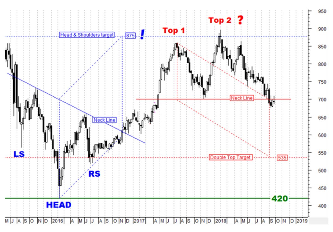 Η ανοδική κίνηση ήταν προϊόν ενός όμορφου ανοδικού αντιστρεπτικού σχηματισμού (Ώμου – Κεφάλι – Ώμου) που όπως φαίνεται στο παρακάτω σχήμα με την ολοκλήρωσή του (ανοδική διάσπαση της γραμμής λαιμού στις 610 περίπου μονάδες τον Νοέμβριο του 16) μας έδωσε ανοδικό στόχο στις 875 μονάδες.