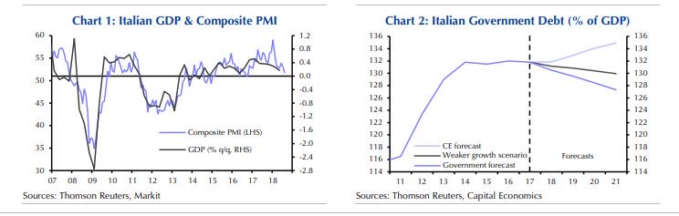 Υπεραισιόδοξες χαρακτηρίζουν οι αναλυτές της Capital Economics τις εκτιμήσεις της ιταλικής κυβέρνησης για την ανάπτυξη της οικονομίας, ενώ προειδοποιούν ότι το δημόσιο χρέος αντί να μειωθεί, θα αυξηθεί στο 135% του ΑΕΠ έως το 2021 και ότι η Ρώμη οδεύει προς σύγκρουση με τις Βρυξέλλες.