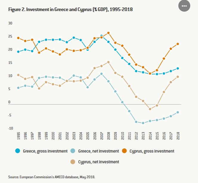Τόσο η ακαθάριστη όσο και η καθαρή επένδυση μειώθηκαν σημαντικά και στην Κύπρο (από ένα κάπως υψηλότερο επίπεδο), αλλά η Κύπρος είχε ταχεία ανάκαμψη και οι καθαρές επενδύσεις υπερβαίνουν τώρα το 10% του ΑΕΠ, το οποίο υπολείπεται από τον ιστορικό μέσο όρο του 2000-2008.