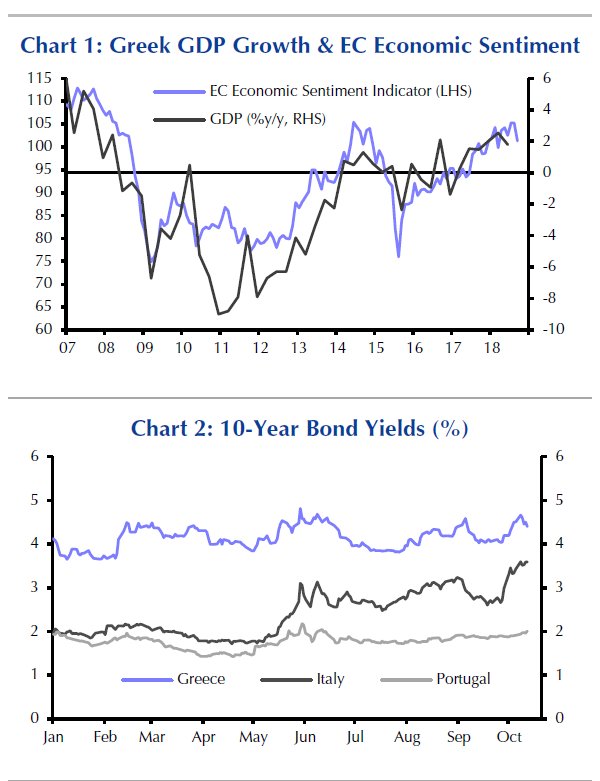 Συνολικά, η αύξηση του ελληνικού ΑΕΠ θα επιβραδυνθεί σε μόλις 1% έως το 2020, οδηγώντας τα δημόσια οικονομικά σε επιδείνωση και τις αποδόσεις των ομολόγων σε αύξηση.