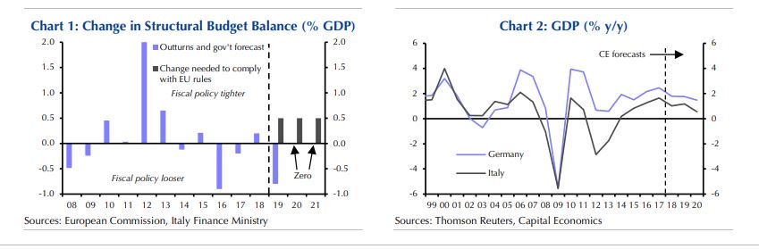 Η ιταλική κυβέρνηση δεν προχώρησε σε αναθεώρηση των στόχων για έλλειμμα και ανάπτυξη και η Capital Economics εκτιμά ότι η Κομισιόν θα απορρίψει τον προϋπολογισμό του 2019 για τρεις βασικούς λόγους: