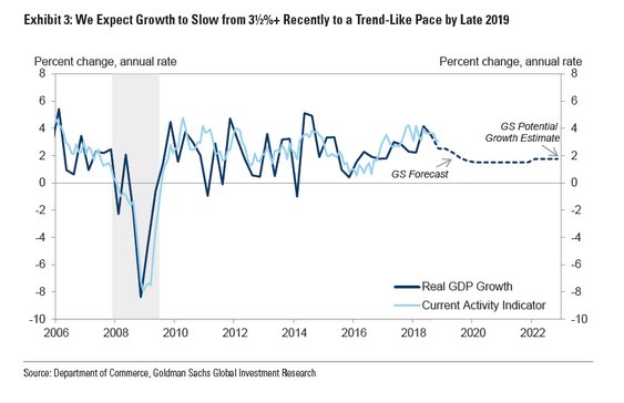 Σύμφωνα με τον Jan Hatzius, επικεφαλής οικονομολόγο της Goldman Sachs, η ανάπτυξη των ΗΠΑ στα τέλη του 2019 θα διαμορφωθεί κοντά στο 1,75% από σχεδόν 3,5% που είναι αυτή τη στιγμή, καθώς «αναμένουμε πιο σφιχτές χρηματοοικονομικές συνθήκες και εξασθένιση της θετικής επίδρασης από το δημοσιονομικό πακέτο του Donald Trump».