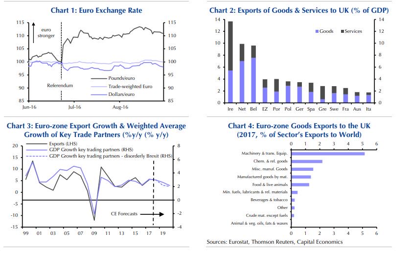 Όπως αναφέρει χαρακτηριστικά η Capital Economics, ενώ το ενδεχόμενο ενός Brexit χωρίς συμφωνία αποτελεί κίνδυνο για την οικονομία της Ευρωζώνης, είναι πολύ λιγότερο ανησυχητικό σε σχέση με τα δημοσιονομικά προβλήματα της Ιταλίας.