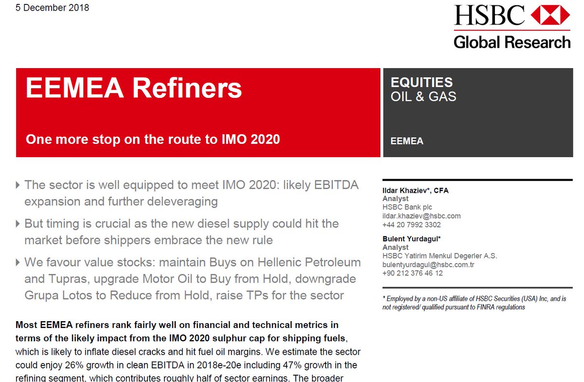 Ειδικότερα, στην ανάλυσή της για τα διυλιστήρια της ευρύτερης περιοχής της Ευρώπης και της Μέσης Ανατολής, η HSBC αναβαθμίζει στα 11,70 ευρώ την τιμή στόχο των ΕΛΠΕ, από 10 ευρώ προηγουμένως, και στα 30 ευρώ για την Motor Oil, από 21 ευρώ προηγουμένως.
