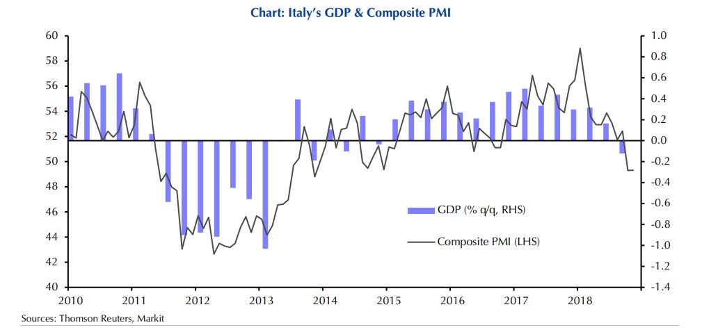 Στο χείλος της ύφεσης βρίσκεται η ιταλική οικονομία, προειδοποιεί η Capital Economics, με τους αναλυτές να αναμένουν περαιτέρω αύξηση των αποδόσεων στα ιταλικά ομόλογα το 2019.