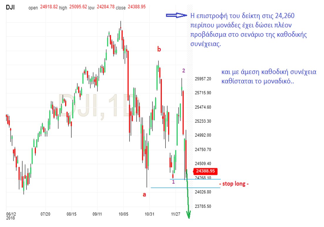 Στην περίπτωση καθοδικής διάσπασης των 592 μονάδων η καθοδική κίνηση δεν έχει ολοκληρωθεί και επανέρχεται το κάτω όριο των 525-540 μονάδων πριν την οριστική ανοδική αντιστροφή που αναβάλλεται για αργότερα (μέσα στο πρώτο τρίμηνο του 2019).