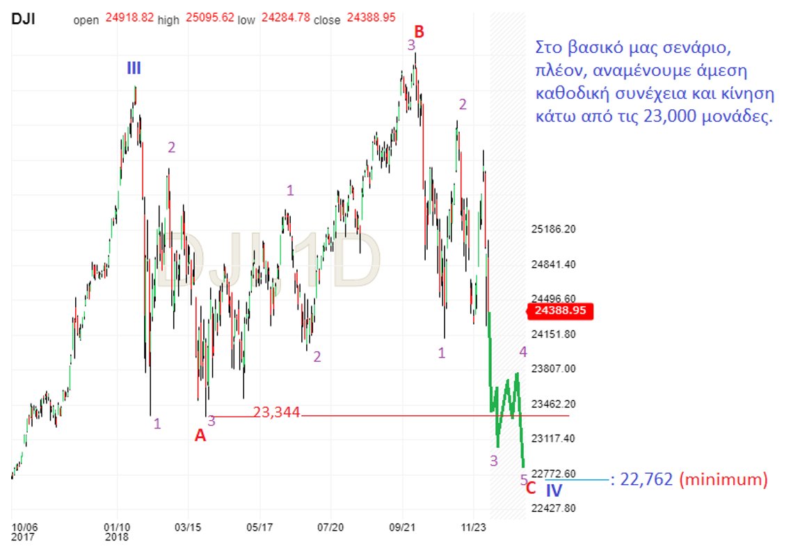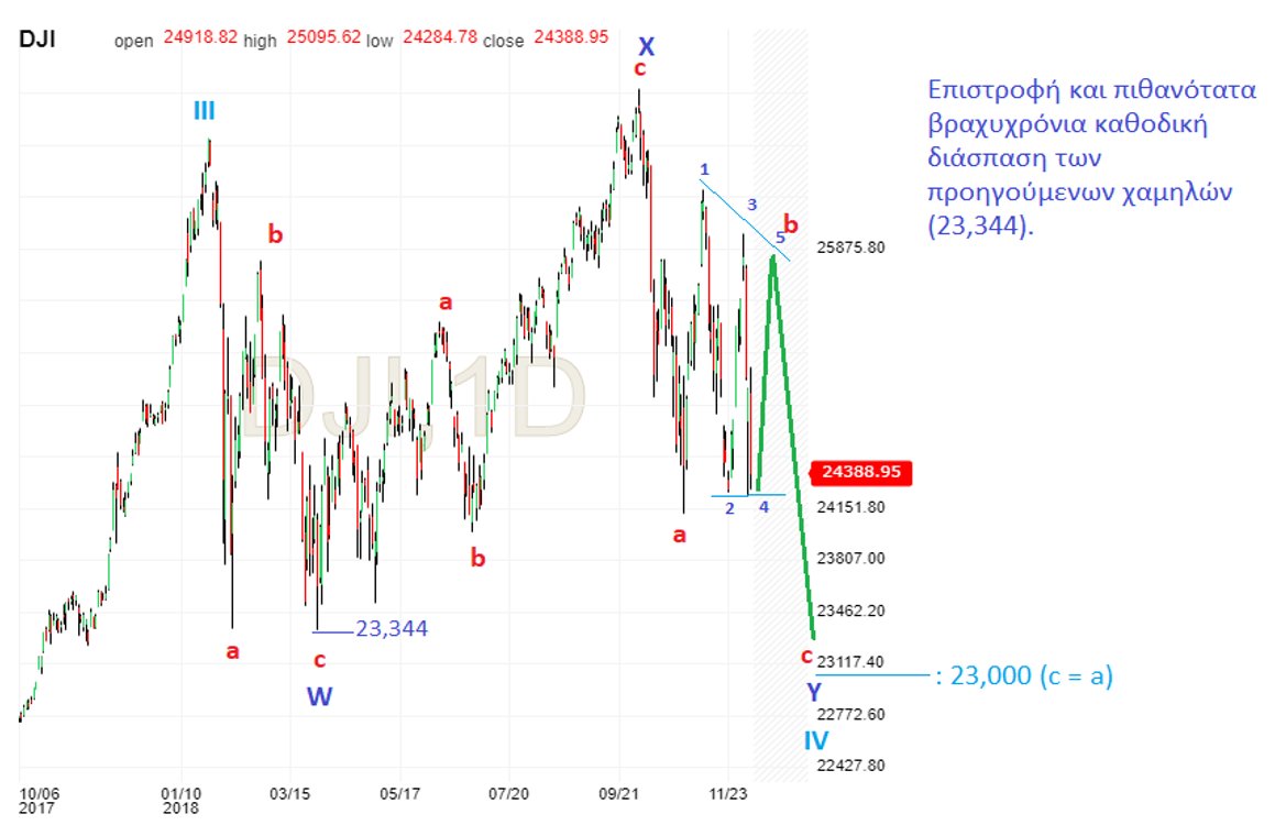 Στο παρόν χρόνο, ο δείκτης μπορεί να κατευθυνθεί άμεσα καθοδικά η στην καλύτερη περίπτωση να επανέλθει για μια τελευταία φορά προς τις 25,750 μονάδες (δευτερεύον σενάριο) διαμορφώνοντας ένα σχηματισμό τριγώνου ως ''b''. Βασικός στόχος του η προσέγγιση των προηγούμενων χαμηλών και πιθανότατα την βραχυχρόνια καθοδική τους διάσπαση. Από τα σημεία που φαίνονται στα διαγράμματα (και στα δύο σενάρια) αναμένουμε τον δείκτη να αντιστρέψει την μεσοχρόνια πορεία του.