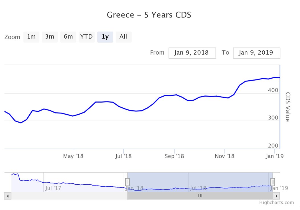 Το κόστος ασφάλισης των ελληνικών ομολόγων (CDS) πενταετούς διάρκειας πριν σχεδόν ένα χρόνο στις 31 Ιανουάριου του 2018 είχαν πέσει στις 290,4 μονάδες βάσης αποτυπώνοντας τότε, την προσδοκία της αγοράς πως η Ελλάδα θα καταφέρει να βγει από το πρόγραμμα.