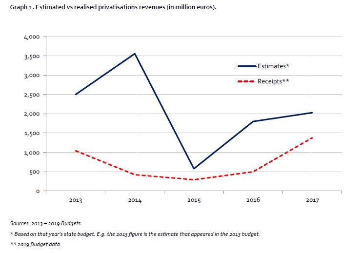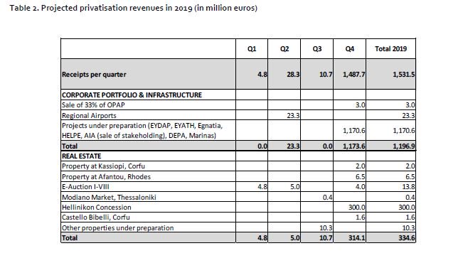 Σύμφωνα με τον Προϋπολογισμό του 2019, ο στόχος εσόδων από αποκρατικοποιήσεις για το 2019 ανέρχεται σε 1,5 δις. ευρώ.