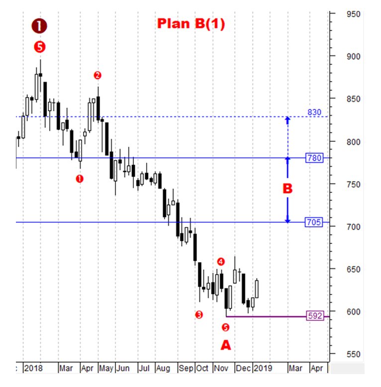 Θα ακολουθήσει μεσοπρόθεσμη ανοδική κίνηση (κύμα Β) που θα φτάσει στην περιοχή [705-780] χωρίς να αποκλείεται επέκτασή της μέχρι τις 830 μονάδες.