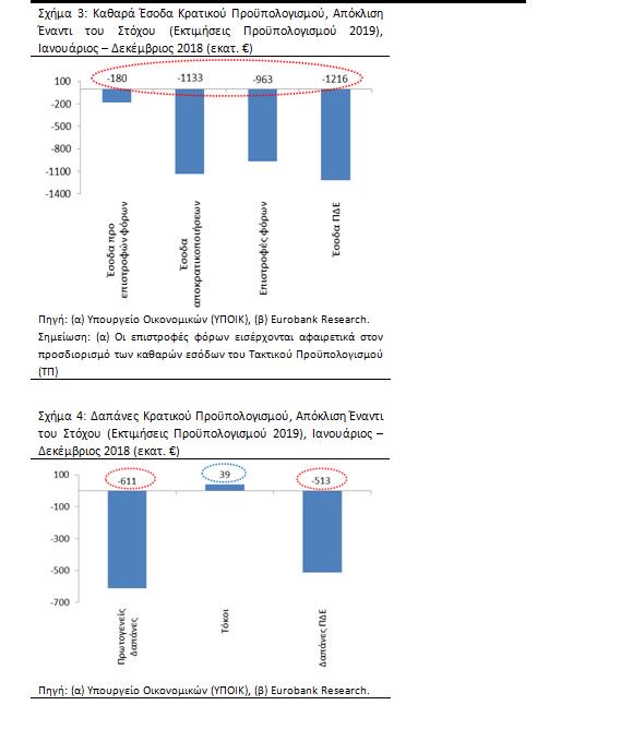 Σύμφωνα με τα προσωρινά στοιχεία εκτέλεσης του Κρατικού Προϋπολογισμού (ΚΠ), για την περίοδο Ιανουαρίου – Δεκεμβρίου 2018 τα καθαρά έσοδα παρουσίασαν υστέρηση έναντι του στόχου (που έχει περιληφθεί για το 2018 στην εισηγητική έκθεση του προϋπολογισμού 2019) κατά -€1.566 εκατ. σε τροποποιημένη ταμειακή βάση. Από την πλευρά των δαπανών καταγράφηκε συγκράτηση έναντι του στόχου κατά -€1.085 εκατ. Ως εκ τούτου, το πρωτογενές αποτέλεσμα και το ισοζύγιο ΚΠ ήταν χαμηλότερα σε σχέση με το στόχο κατά -€443 εκατ. και -€481 εκατ. αντίστοιχα.