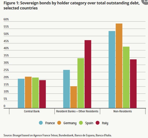 Επίσης, το σχετικά χαμηλότερο ποσοστό των αλλοδαπών κατόχων δεν υπήρξε σταθερό: γύρω στο 2005, τα κρατικά ομόλογα της Γαλλίας, της Γερμανίας, της Ιταλίας και της Ισπανίας κρατούνταν από αλλοδαπούς σε πολύ παρόμοιο επίπεδο (περίπου 50%).