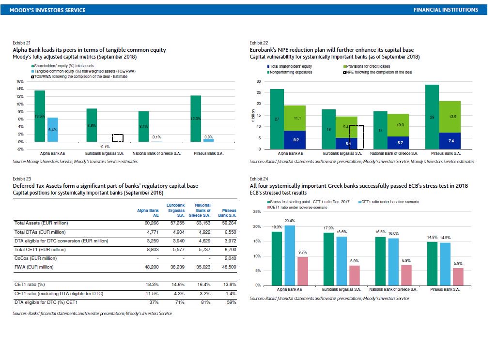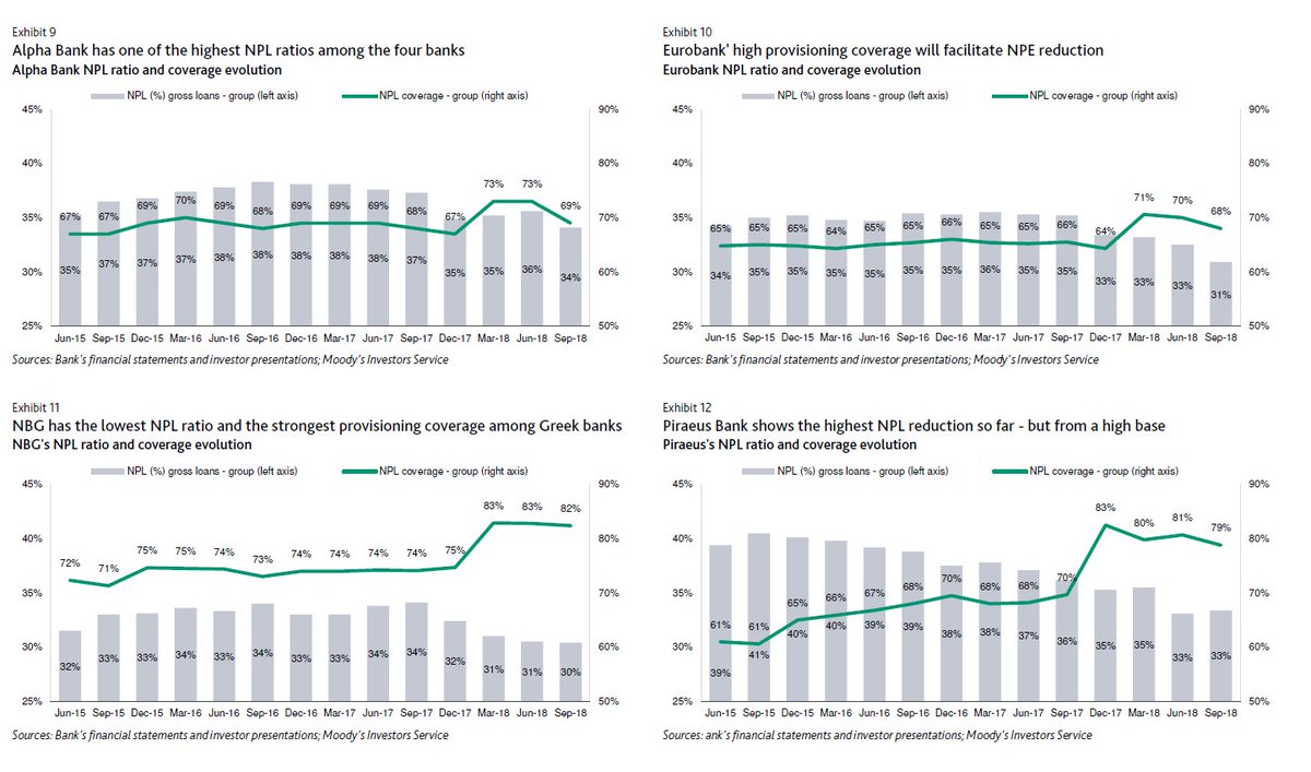 Ειδικότερα, στην σημερινή, 28 Ιανουαρίου 2019, 17σέλιδη ανάλυσή της με τίτλο "Eurobank and NBG best placed to materially reduce their NPEs by 2021; Alpha Bank has the strongest tangible capital base" (Eurobank και Εθνική βρίσκονται σε καλύτερη θέση για τη μείωση των NPEs έως το 2021, η Alpha Bank έχει την καλύτερη κεφαλαιακή βάση), που σας παρουσιάζει το www.bankingnews.gr, η Moody's υπενθυμίζει ότι τα μη εξυπηρετούμενα ανοίγματα του κλάδου ανέρχονται στο 47% των ακαθάριστων δανείων του τραπεζικού τομέα από τον Σεπτέμβριο του 2018, εξαιτίας της υψηλής ανεργίας και της βαθιάς ύφεσης της χώρας τα τελευταία χρόνια.