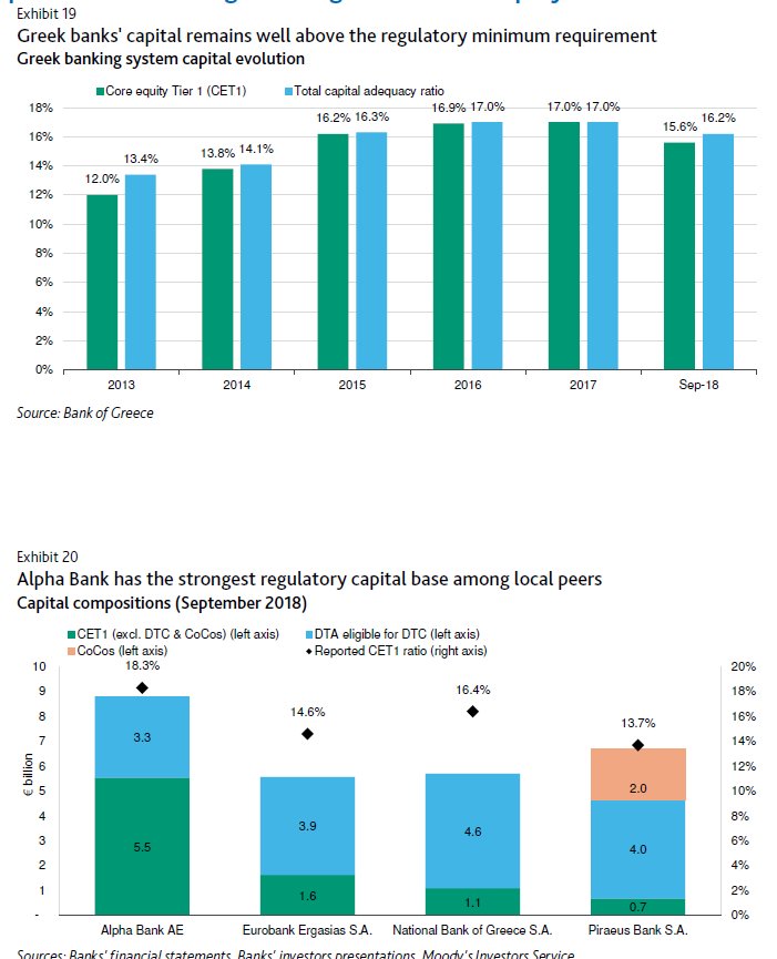 Αναφορικά με την κεφαλαιακή επάρκεια των ελληνικών τραπεζών, η Moody's επισημαίνει ότι μπορεί ο μέσος όρος Common Equity Tier 1 (CET1) να είναι περίπου 15,6% των σταθμισμένων στοιχείων ενεργητικού τον Σεπτέμβριο του 2018, ωστόσο, η ποιότητα του κεφαλαίου είναι ασθενής.