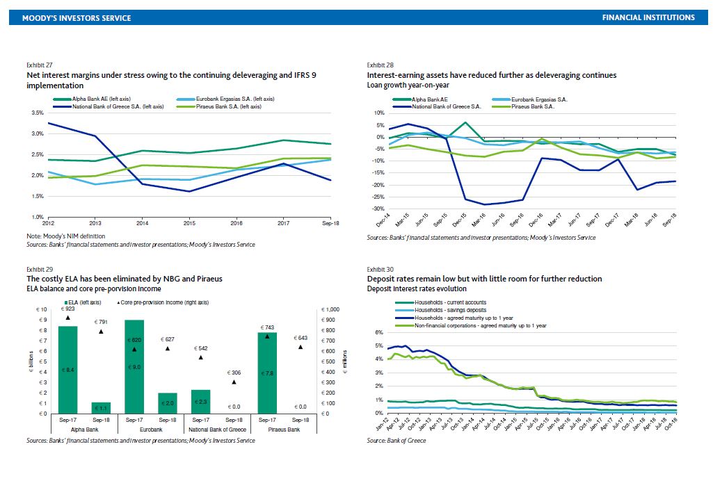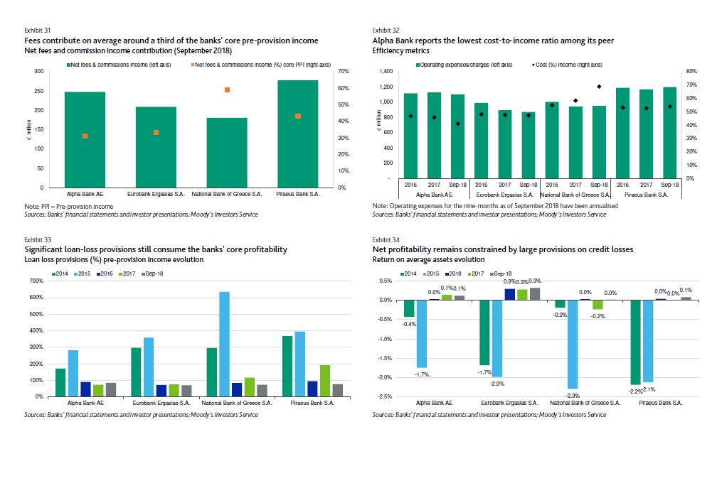 Έτσι, η Moody's αναμένει και οι τέσσερις τράπεζες να είναι οριακά κερδοφόρες την περίοδο 2019-20, με την πίεση στα margins να παραμένει λόγω των μειωμένων όγκων δανείων και των υψηλότερων αναγκών κάλυψης των μετά την εφαρμογή των νέων λογιστικών προτύπων του ΔΠΧΑ 9.