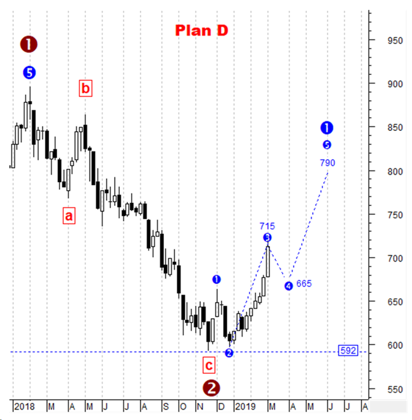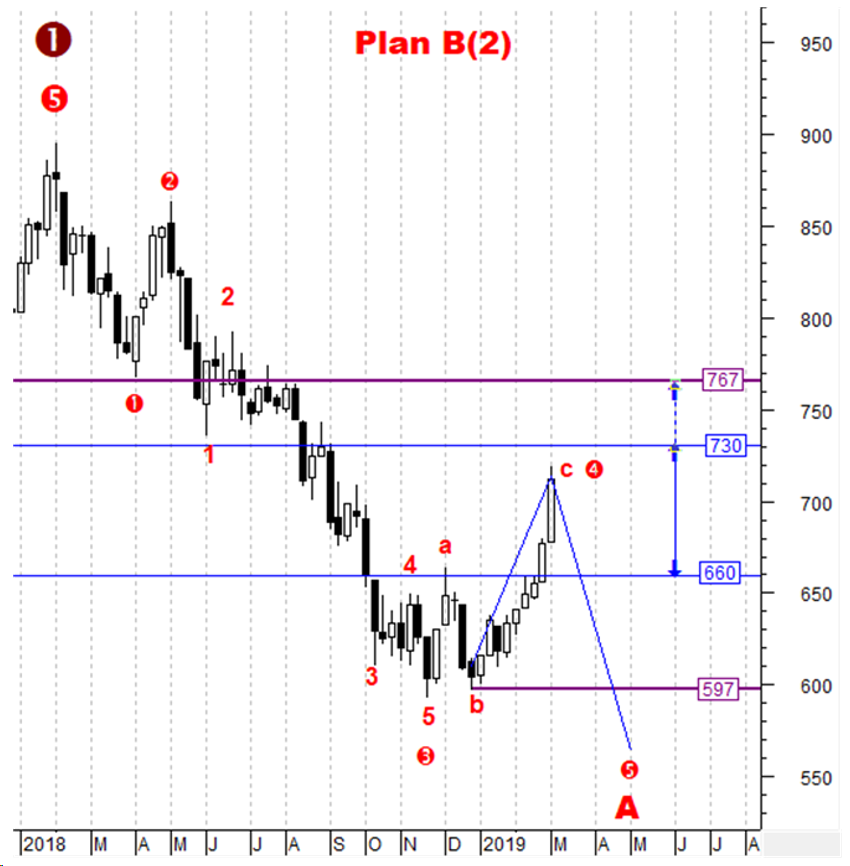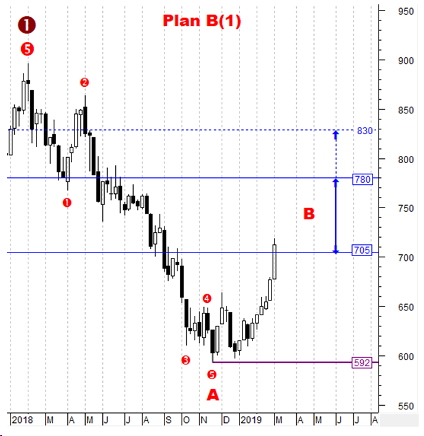8/2/19: "Βρίσκεται σε εξέλιξη μεσοπρόθεσμη ανοδική κίνηση (κύμα Β) που θα φτάσει στην περιοχή [705-780] χωρίς να αποκλείεται επέκτασή της μέχρι τις 830 μονάδες.