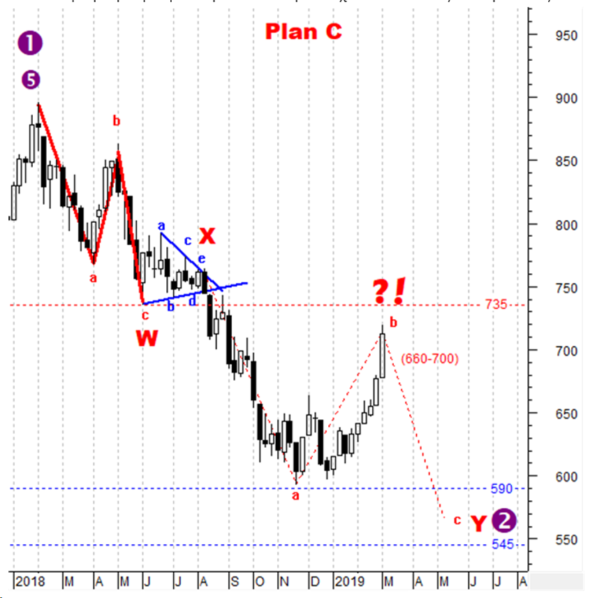Η μακροπρόθεσμη καθοδική κίνηση δεν έχει τελειώσει και στη συνέχεια θα ακολουθήσει καθοδικό C που θα πετύχει νέο χαμηλό (περίπου 520-540 μονάδες)."
