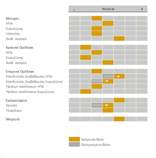 Παράλληλα αναβαθμίζουμε την άποψη μας για τα ομόλογα των ΗΠΑ σε ουδέτερη, από ήπια αρνητική, κυρίως με αύξηση των εταιρικών ομολόγων επενδυτικής διαβάθμισης.