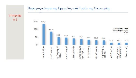 Σε κλαδικό επίπεδο, προκύπτει ότι την υψηλότερη παραγωγικότητα εργασίας μεταξύ των διεθνώς εμπορεύσιμων τομέων της οικονομίας παρουσιάζουν οι κλάδοι του ηλεκτρισμού, των ορυχείων-λατομείων, καθώς και των τεχνολογιών, πληροφορικής και επικοινωνιών, ενώ τη χαμηλότερη ο κλάδος καταλυμάτων και εστίασης (Γράφημα 3).