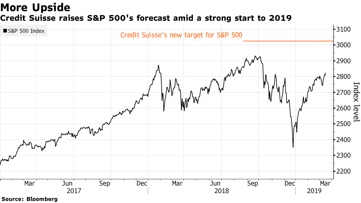 Ο αναλυτής της Credit Suisse, Jonathan Golub, εκτιμά ότι ο δείκτης θα «κλείσει» το 2019 στις 3.025 μονάδες, δηλαδή 100 μονάδες υψηλότερα από την προηγούμενη εκτίμησή του και κατά 7% υψηλότερα σε σύγκριση με το κλείσιμο του συγκεκριμένου δείκτη την Παρασκευή 15/3.
