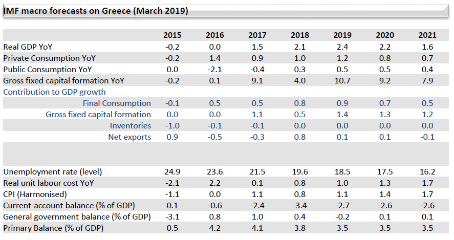 Σε αυτό το πλαίσιο, οι περισσότεροι δείκτες έχουν γυρίσει θετικοί, με το ΔΝΤ να εκτιμά ότι η ανάπτυξη το 2019 αναμένεται στο 2,4%, το 2020 στο 2,2% και το 2021 στο 1,6%.