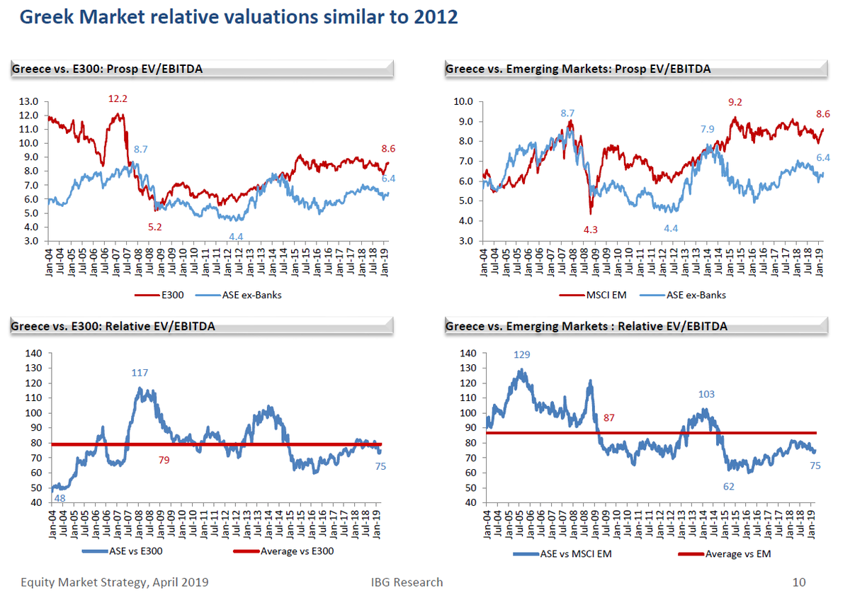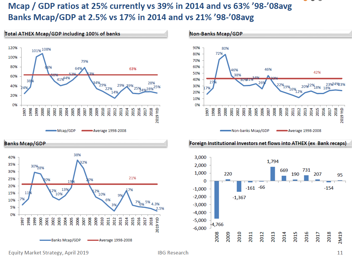 Αναφορικά με την ελληνική κεφαλαιαγορά, η IBG τονίζει ότι η σχετική αποτίμηση του ΧΑ ομοιάζει με εκείνη του 2012, ενώ ο δείκτης κεφαλαιοποίησης/ΑΕΠ είναι στο 25% έναντι 39% το 2014 και 63% την περίοδο 1998-2008.
