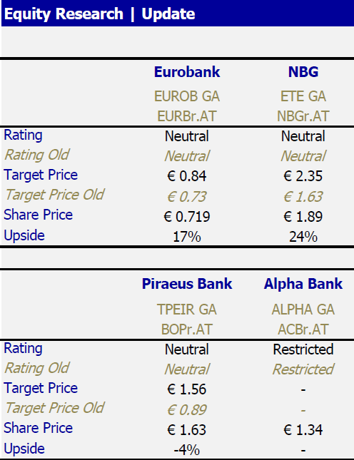 Σε σημαντική αύξηση των τιμών στόχων των ελληνικών τραπεζών προχώρησε η Alpha Finance, αλλά παραμένει "ουδέτερη" (neutral) στη σύστασή της.