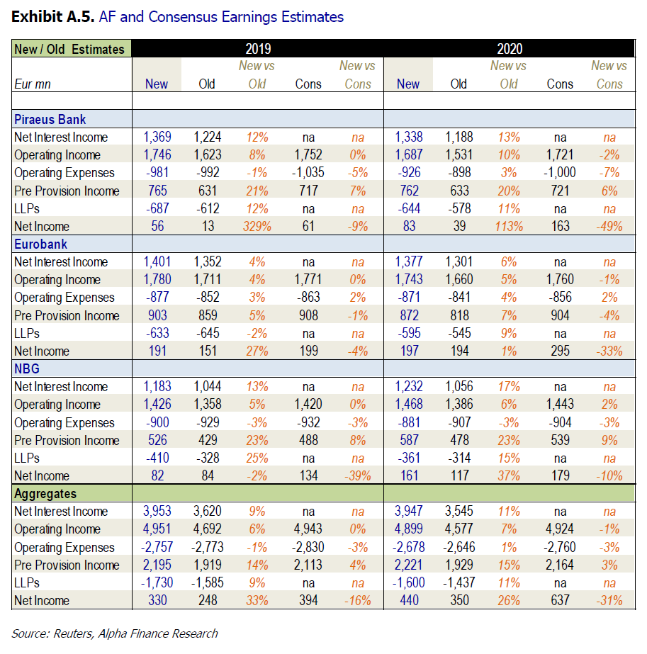 Η Alpha Finance προχώρησε και σε οριακή αναβάθμιση των εκτιμήσεών της για τα μεγέθη των τραπεζών, σε μια προσπάθεια να αποτυπώσει τη σταθεροποίηση των περιθωρίων απόδοσης δανείων, τη βελτίωση των προοπτικών NII (σε ορισμένες περιπτώσεις) και το χαμηλότερο λειτουργικό κόστος.