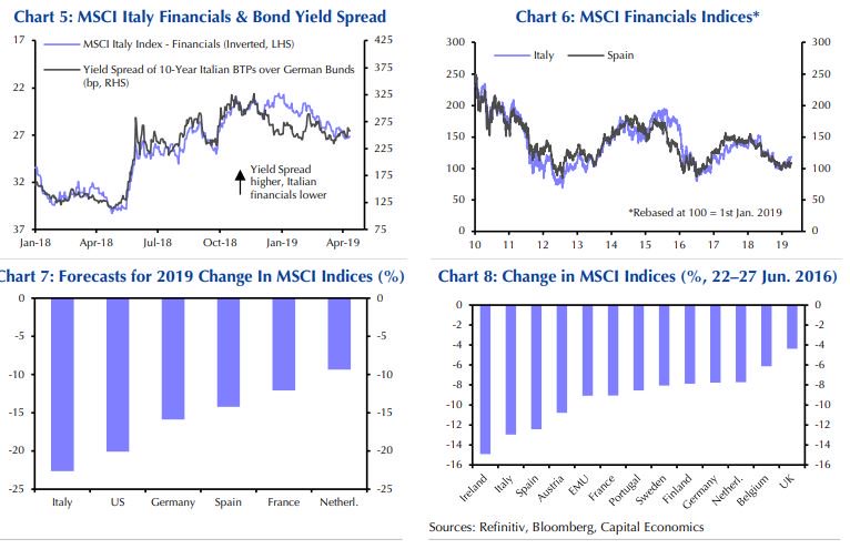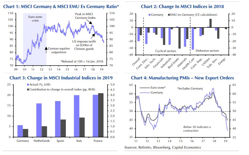 Η υποαπόδοση των μετοχών σε Ιταλία και Γερμανία το 2019 θα συμπαρασύρει στην πτώση και τις υπόλοιπες μετοχές της Ευρωζώνης, προειδοποιεί η Capital Economics σε ανάλυσή της με ημερομηνία 12 Απριλίου 2019.