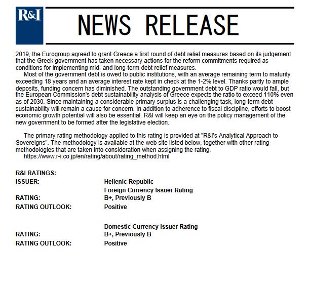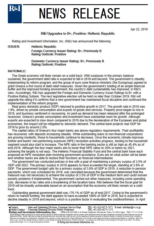 Ο ιαπωνικός οίκος αξιολόγησης Rating and Investment Information (R&I) ανακοίνωσε σήμερα (22/4) ότι αναβάθμισε την πιστοληπτική ικανότητα της Ελλάδας σε Β+ από Β, με θετικές προοπτικές.