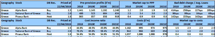 Για την Τράπεζα Πειραιώς, η Deutsche Bank προβλέπει ότι το αναπροσαρμοσμένο P/E αναμένεται να διαμορφωθεί στο 6,6 φέτος και στο 3 το 2021 ενώ η σχέση τιμής προς λογιστική αξία εκτιμάται στο 0,13 το 2021.