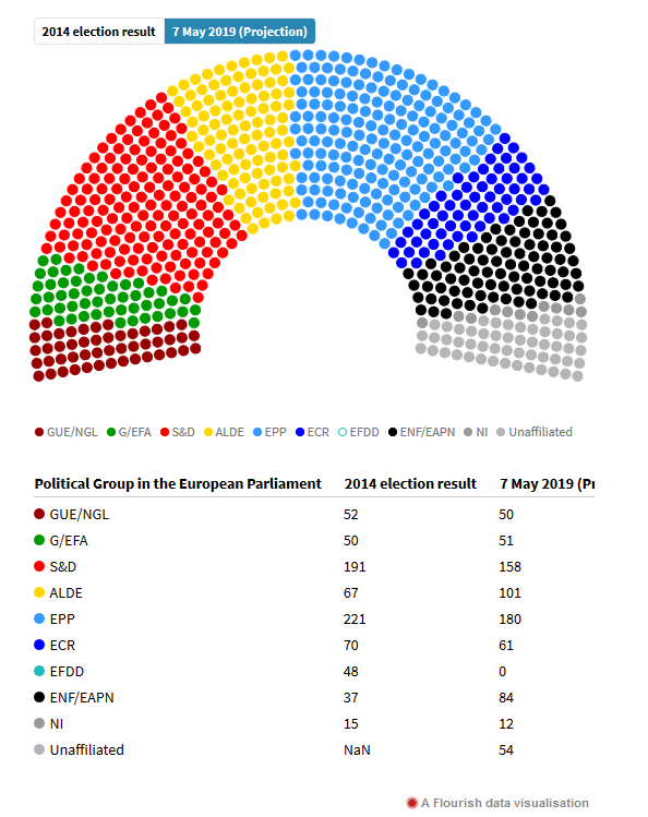 Όπως φαίνεται στον πίνακα-γράφημα που ακολουθεί, το Ευρωπαϊκό Λαϊκό Κόμμα (ΕΡΡ-ΕΛΚ) θα παραμείνει η μεγαλύτερη δύναμη καθώς εκτιμάται ότι θα κατακτήσει 180 έδρες.
