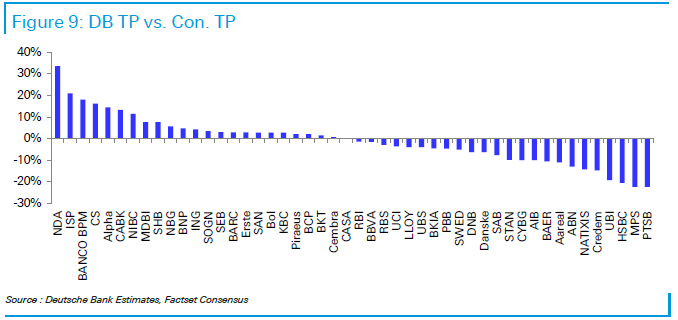 Συγκρίνοντας τις τιμές στόχους που δίνει για τις τρεις ελληνικές τράπεζες, για την Alpha Bank στα 1,39 ευρώ, για την Εθνική στα 2,1 ευρώ και για την Τράπεζα Πειραιώς στα 1,5 ευρώ, η Deutsche Bank δίνει και τα στοιχεία από άλλες προβλέψεις αναλυτών.